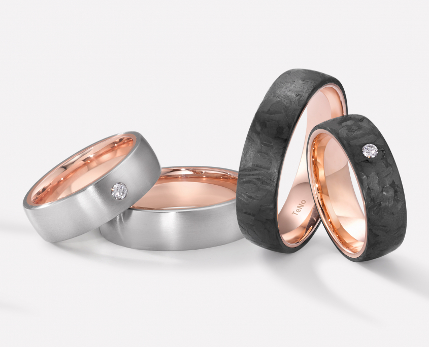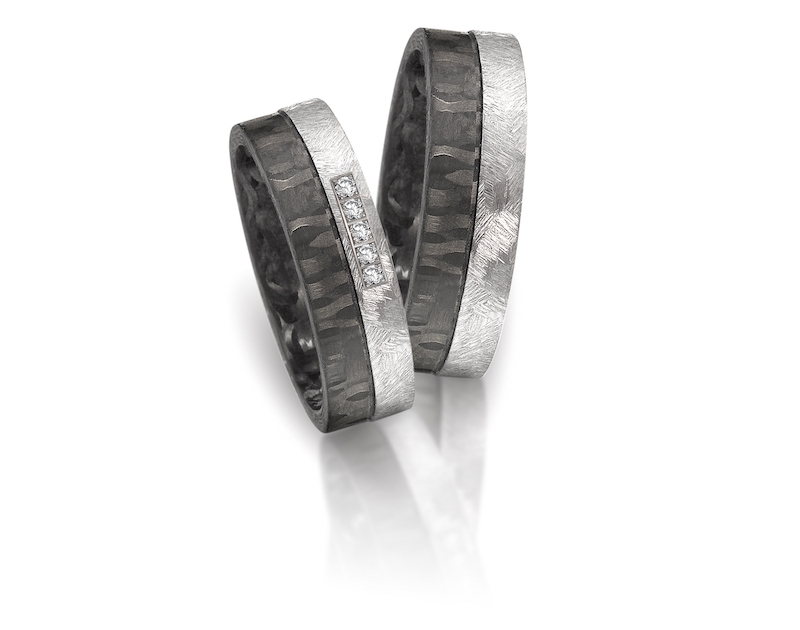 Dennoch sind Kombinationen mit anderen Materialien und Diamanten selbstverständlich möglich. Mit seinem tiefen Schwarz bildet Carbon sogar einen beeindruckenden Kontrast zu den glänzenden, klassischen Edelmetallen – ganz unabhängig davon, ob in Form eines Bicolor-Eherings oder als purer Carbonring in Verbindung mit eurem Verlobungsring aus beispielsweise Gold.